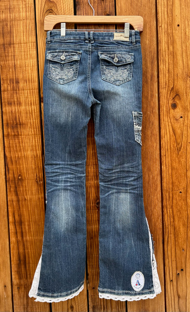 Make a statement with these Almost Famous jeans, size 14, featuring a unique extra pocket adorned with sparkling gems, silver and white accents, and a delicate white lace flare. These stylish jeans combine edgy details with a touch of elegance, perfect for standout looks that shine.