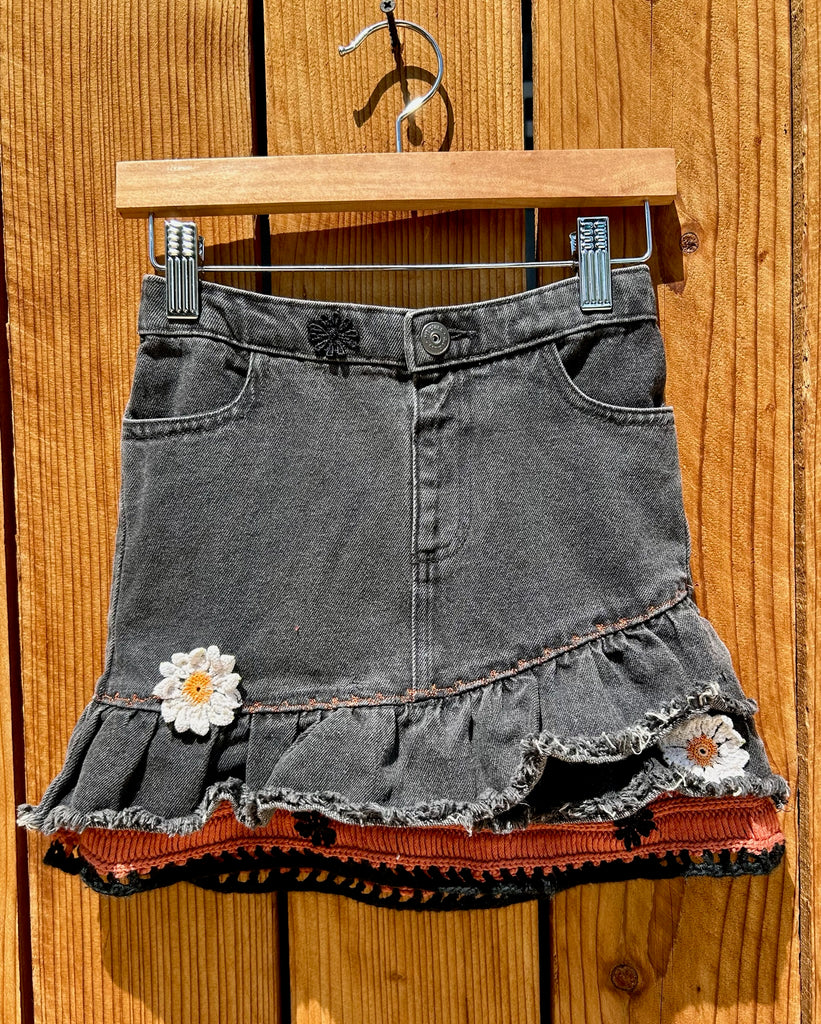 Upcycled Black Denim Skirt with Crochet Daisy Trim