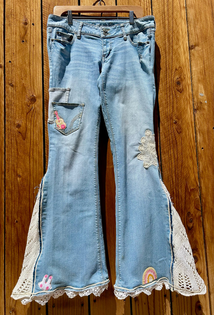 These upcycled American Eagle jeans blend sweet boho charm with playful, musical vibes. Designed with unique handcrafted details, they’re a true one-of-a-kind statement piece.