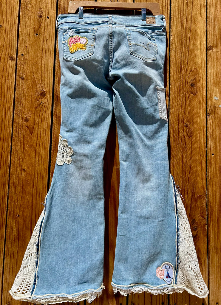 Upcycled American Eagle Flare Jeans – Size 10 – Doily, Floral & Rainbow Accents 🎶🌸🌈
